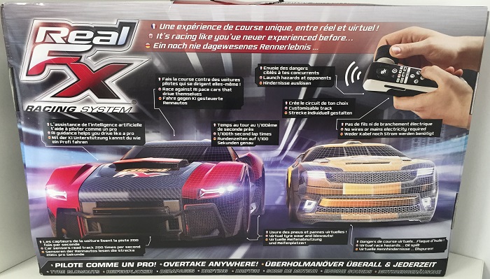 En présentation, l'une des deux voitures et l'une des deux manettes, les 4 modes de jeu mis en avant ainsi que les nombreux réglages possibles qu'offre le circuit RealFX. En un coup d'oeil, on peut déjà remarquer la multitude de fonctionnalités et surtout la description ultra claire du "Pas de rails, pas de limites !".