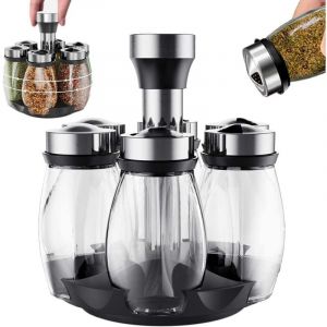 • Tourniquet À Épices,Avec 6 Pots,Étagère Rotative À 360°,Inox,Verre,Hxd 16 X 17 Cm,Carrousel,Argent/Noir - Neuf