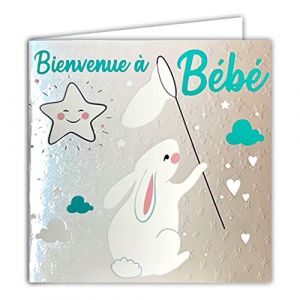 66-1030-B Carte Sincères Félicitations aux Heureux Parents Naissance ou Adoption Garçon Bienvenue à Bébé + Enveloppe 12x17,5cm - Collage Bouton Bleu en Forme d'étoile - Peluche Doudou Lapin Poissons