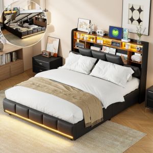 • Lit coffre 160x200, lit double avec sommier, rangement chevet, bande lumineuse LED, port de charge USB,PU,noir
