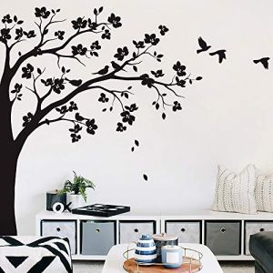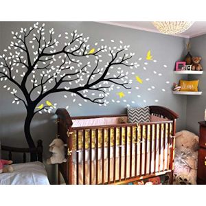 • Sticker mural grand arbre vinyle autocollant arbre soufflant dans le vent décalque mural pour chambre d'enfant 98 (Branches à gauche, Noir; Blanc; Jaune) (Studio Quee, neuf)