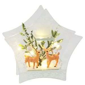 • Photophore en verre avec lumière LED et bougie chauffe-plat avec étoile de Noël, baies, branches de sapin, neige artificielle, décoration de Noël, sapin de Noël, bougeoir, lampe de décoration, cadeau,