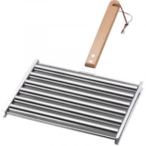 • Rouleau à saucisses pour barbecue en acier inoxydable avec poignée en bois extra longue , pour hot-dog , merguez , grillades , accessoire rotatif de