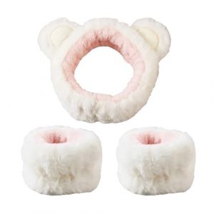 • TOPPERFUN Lot de 2 Bandeaux de Maquillage en Peluche Petit Ours Coiffe Cosmétique Réutilisable Bandeau de Soin des Cheveux Doux pour Lavage du Visage et Spa Couleurs Kaki et Rose Blanc (Linuya, neuf)