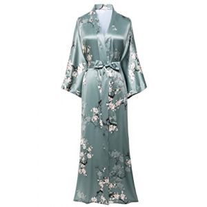 Coucoland Robe de chambre longue en satin pour Femme Robe de plage Kimono Motif à fleurs Cardigan Peignoir Long Imprimé pour Femme Robe Longue FleursPajama Party Style-3-Vert (Lixuanshengang, neuf)