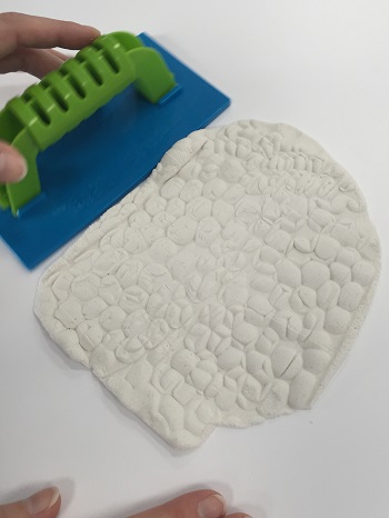 Pour terminer, nous avons utilisé le rouleau ainsi que le tamis ce qui nous a permis de réaliser l'entrée pavée du château. D'abord on étale un peu la pâte à la main puis on passe chacun des accessoires dessus.