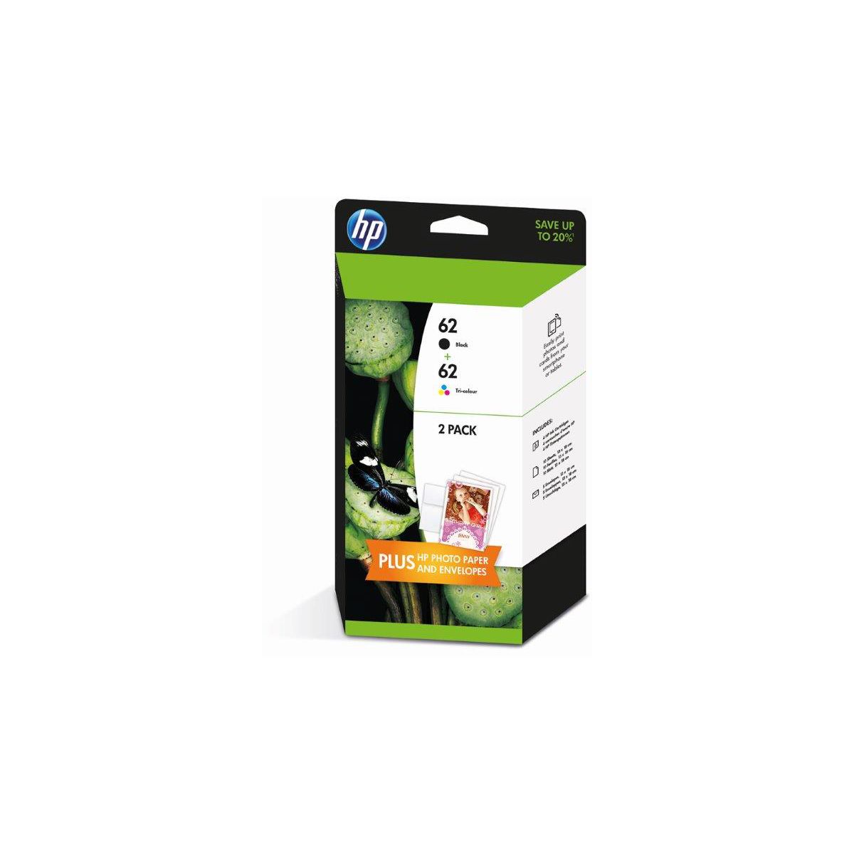 HP 62 - Pack de 2 - noir, couleur (cyan, magenta, jaune) - original - jeu de papier cartouche d'encre - pour Envy 5640, 7640 L Voir site | ![]()