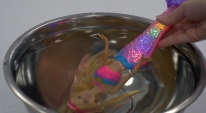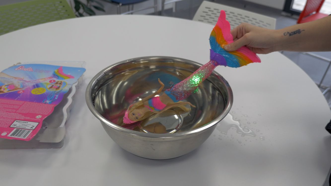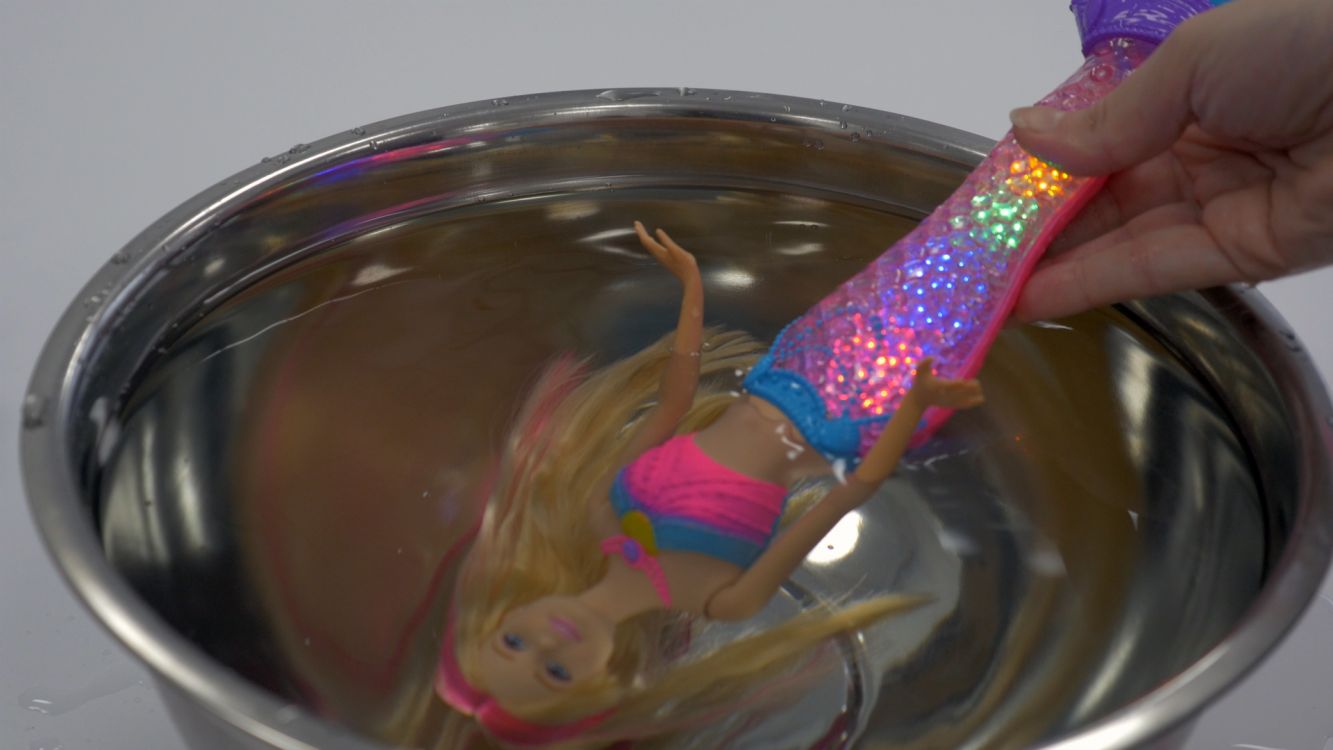 Superbe poupée multicolore, Barbie a revêtu son magnifique habit de sirène. Dans l’eau ou hors de l’eau, la nageoire de Barbie va s’illuminer grâce à plusieurs capteurs. Pour activer les multiples effets, il suffit d’appuyer sur le joyau du collier. La nageoire s’illumine de différentes façons à chaque fois. Il est aussi possible de les activer en plongeant la poupée dans l’eau en commençant par la tête. Les effets de lumière débutent automatiquement.
