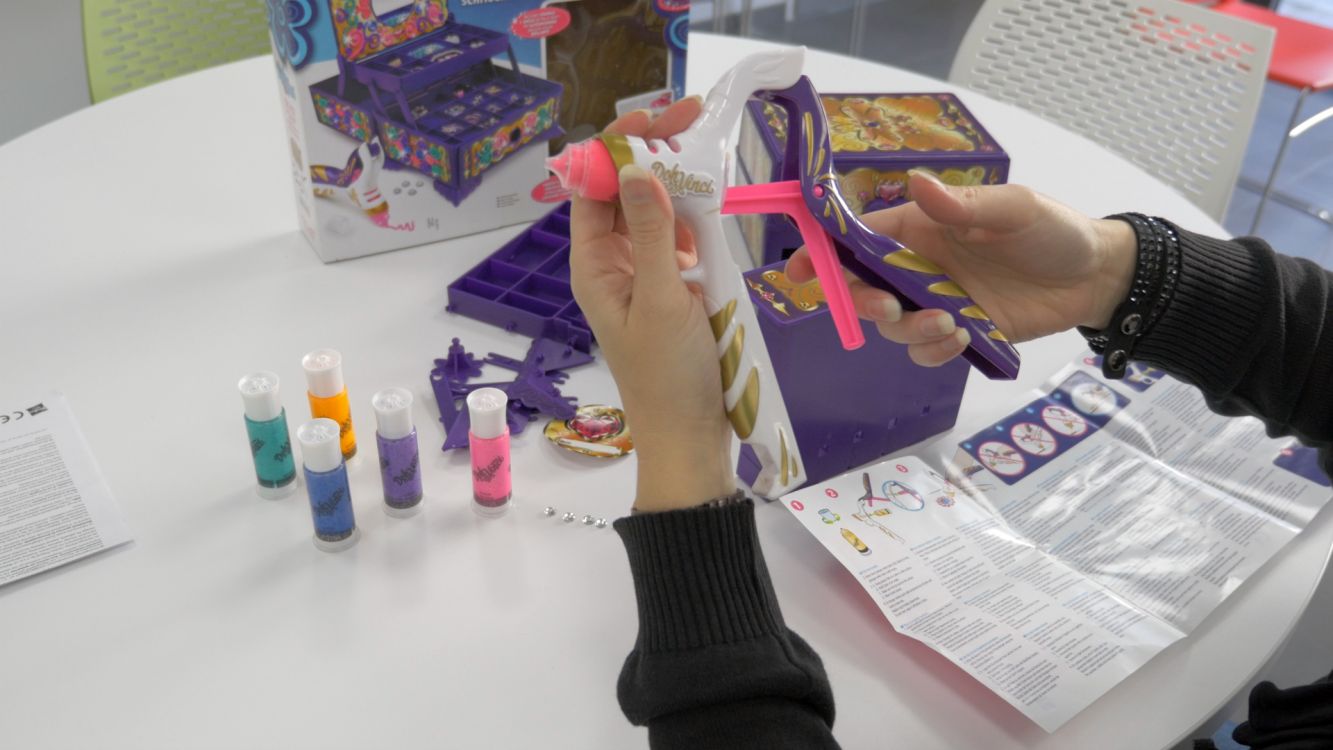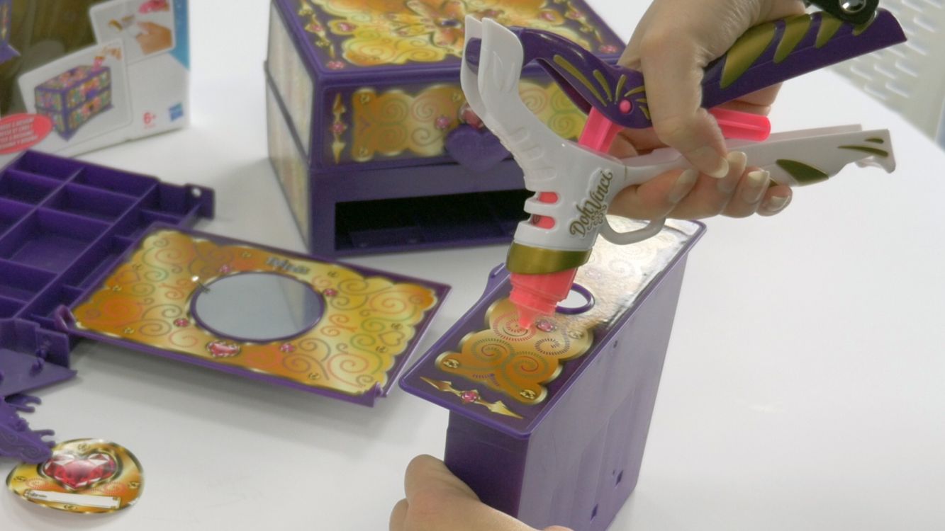 Le coffret inclus 1 pistolet Doh Vinci, 6 tubes de couleur dont 4 à paillettes, 6 strass ainsi que différents éléments à assembler pour que la boîte à bijoux soit complète.
