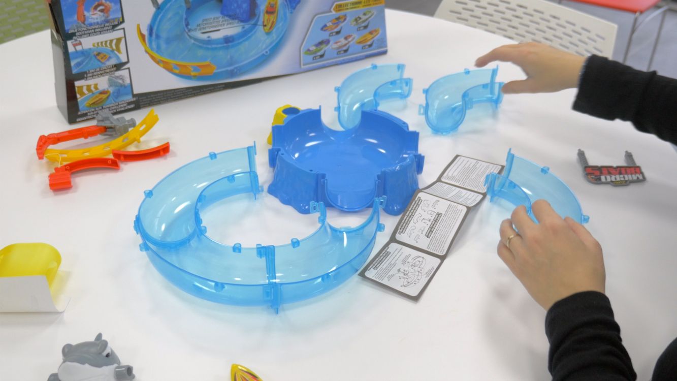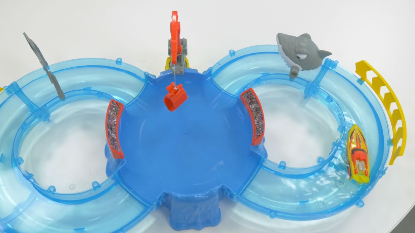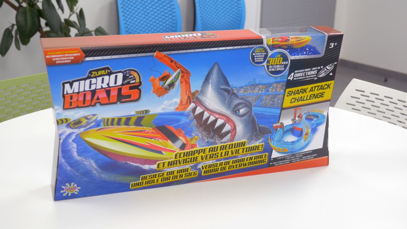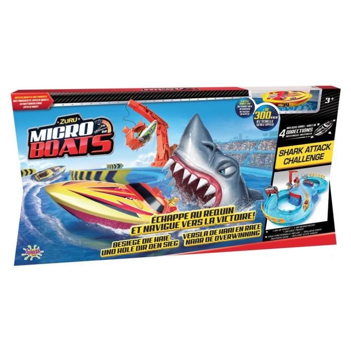 Le coffret contient un bateau Micro Boat rouge, différentes parties à relier entre elles afin d’assembler un véritable parcours ainsi que des accessoires à ajouter comme les terribles dents du requin ou encore la grue à 360°. Déjà incluses, 3 piles LR44 sont nécessaires pour faire fonctionner le bateau Micro Boat.