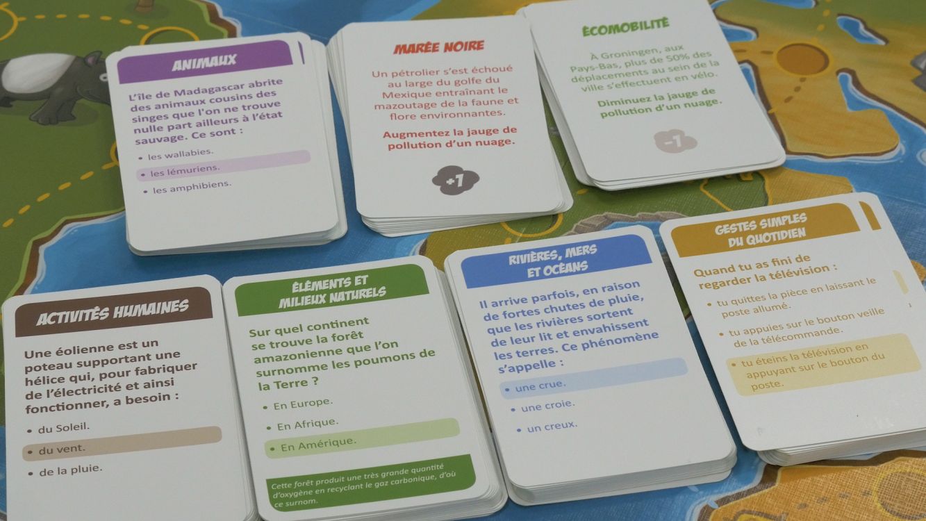 Le coffret contient 1 plateau de jeu, 1 dé, 110 cartes dont 90 cartes « Questions » réparties en différents thèmes tels que Rivières, mers et océans, Activités humaines ou encore Animaux, 20 cartes « Evénements », 6 jetons « Espèce en danger », 6 pions « Super-héros » et 1 pion « Pollution » accompagnés de leurs socles.