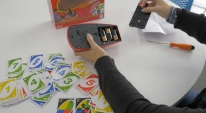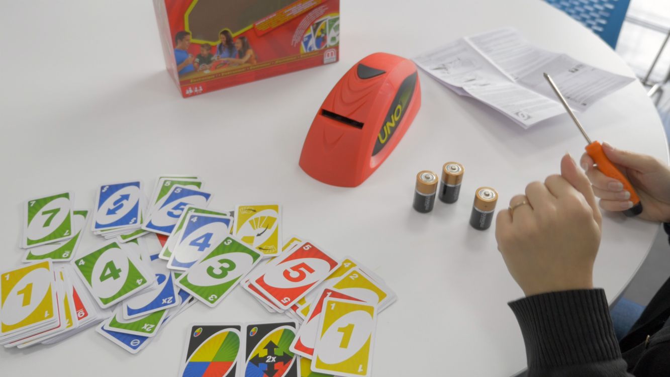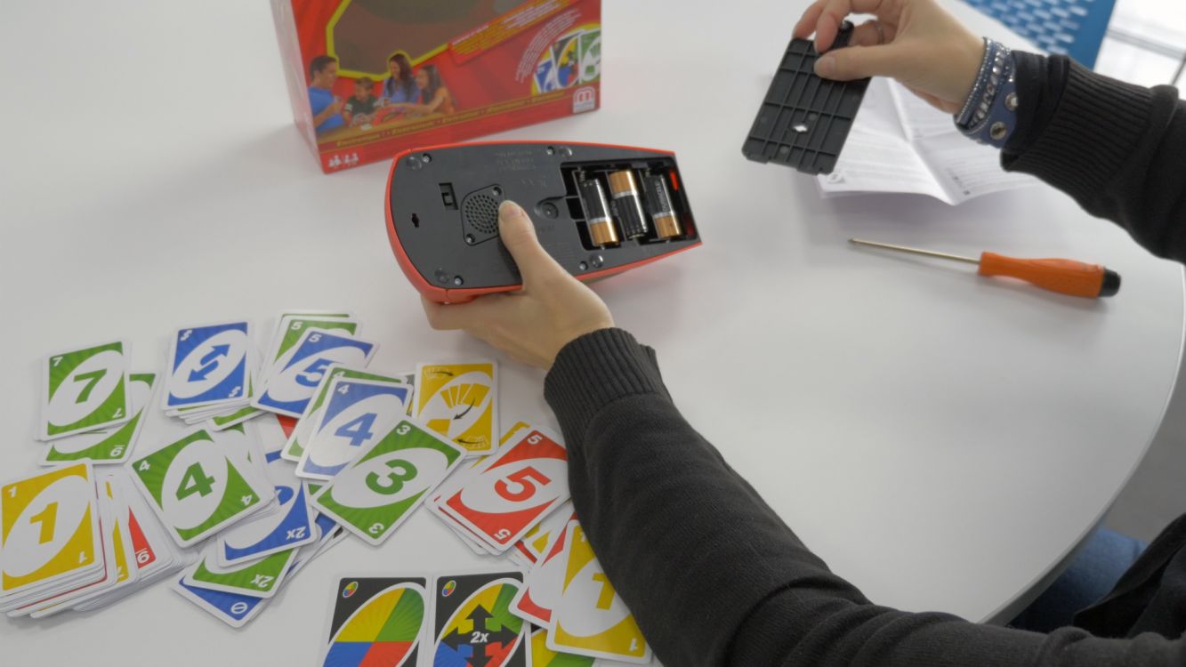 Le coffret contient 112 cartes numérotées de 1 à 9 et réparties en quatre couleurs : bleu, vert, rouge et jaune, 40 cartes Action, 1 distributeur de cartes et la règle du jeu. 3 piles LR14 non fournies sont nécessaires pour faire fonctionner le jeu.