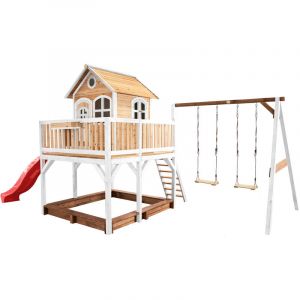 Axi Maisonnette LIAM Brun Blanc avec 2 balancoires et toboggan Rouge et bac à sable L Voir site | ![]()