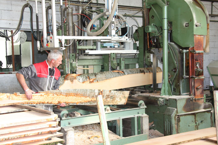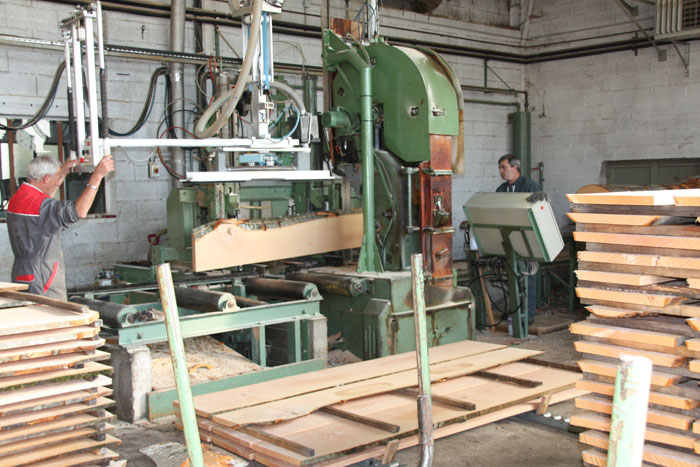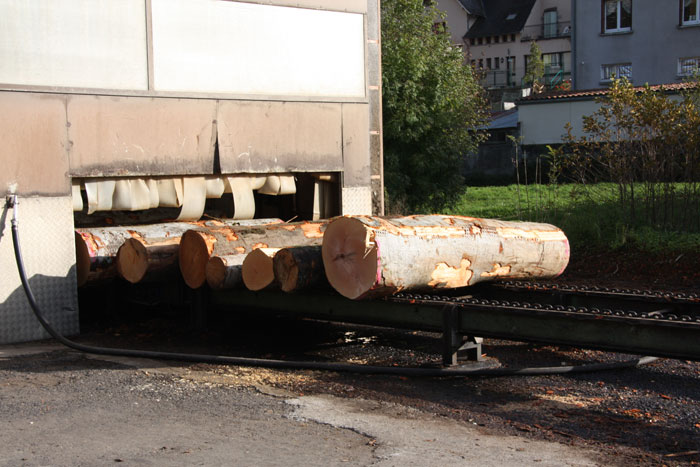 G.C. Nous achetons tout d'abord le bois sous forme d'arbre. Cette grume, c'est comme ça qu'on nomme le tronc d'un arbre, est ensuite tronçonnée et sciée en planches.